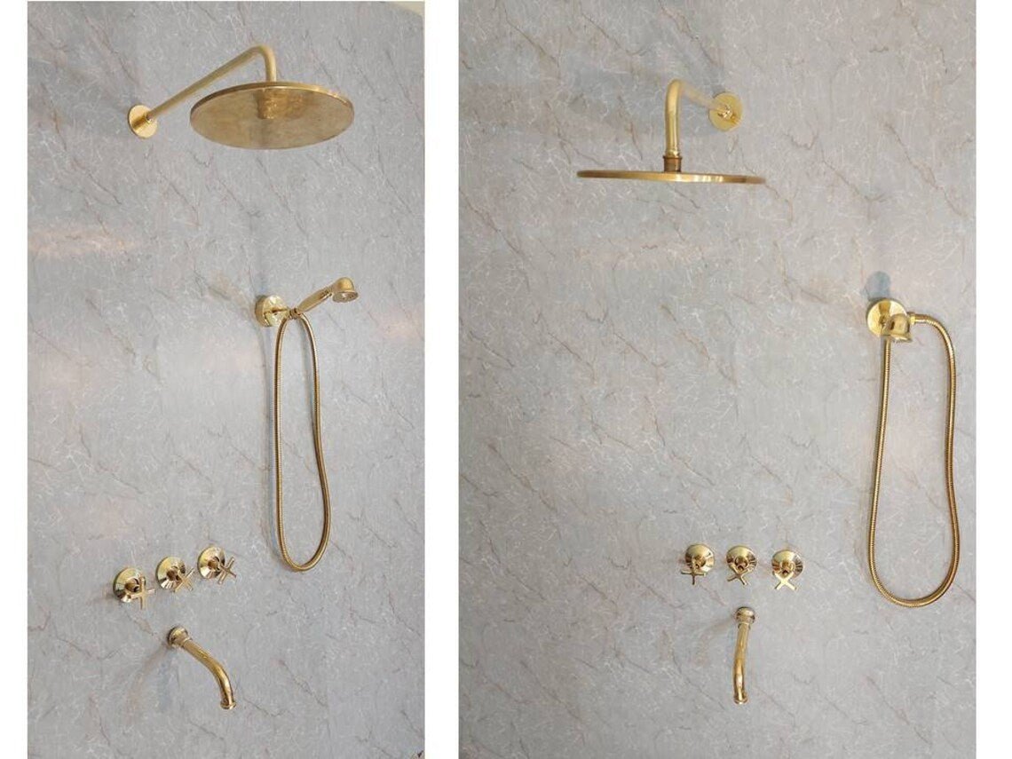 This complete shower system is made of Unlacquered Brass, it develops a natural warm patina. It is handcrafted by our craftsman in Morocco.