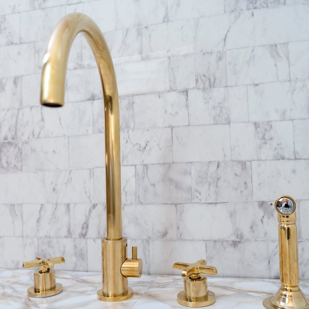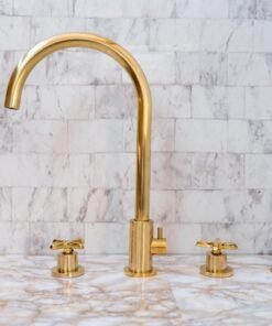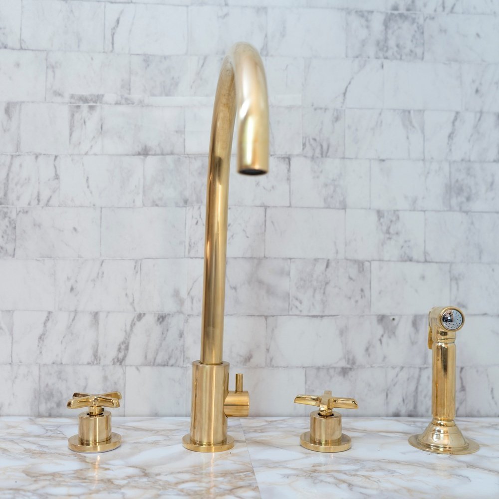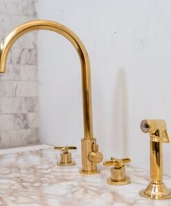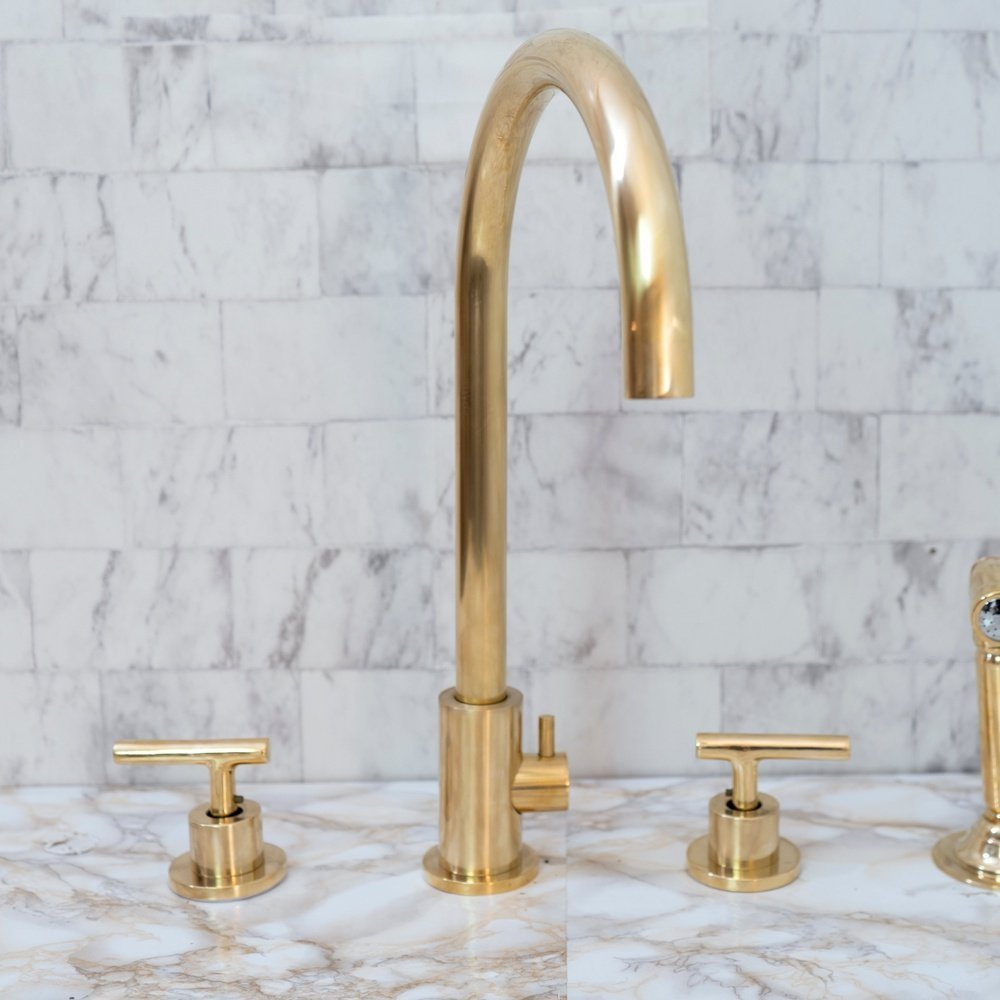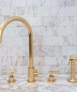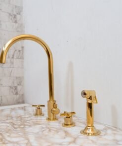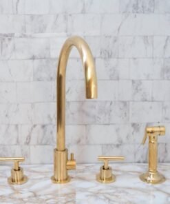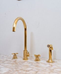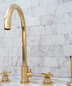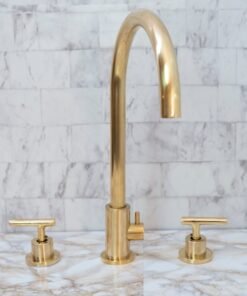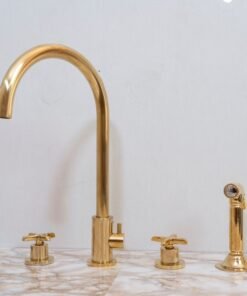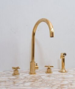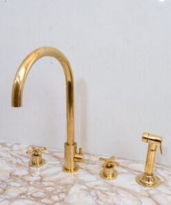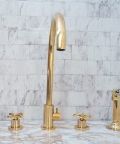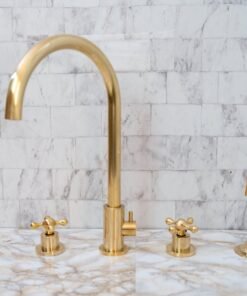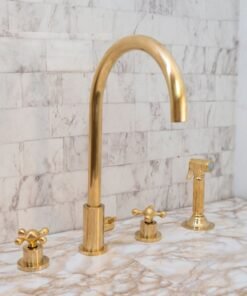 This Unlacquered Brass 4 Holes Bathroom Faucet with sprayer has a gooseneck shape that extends over your sink for a streamlined look and feels. The design of this solid brass product is inspired by the shape of the medina’s door, Traditional handles to control the temperature and water flow.